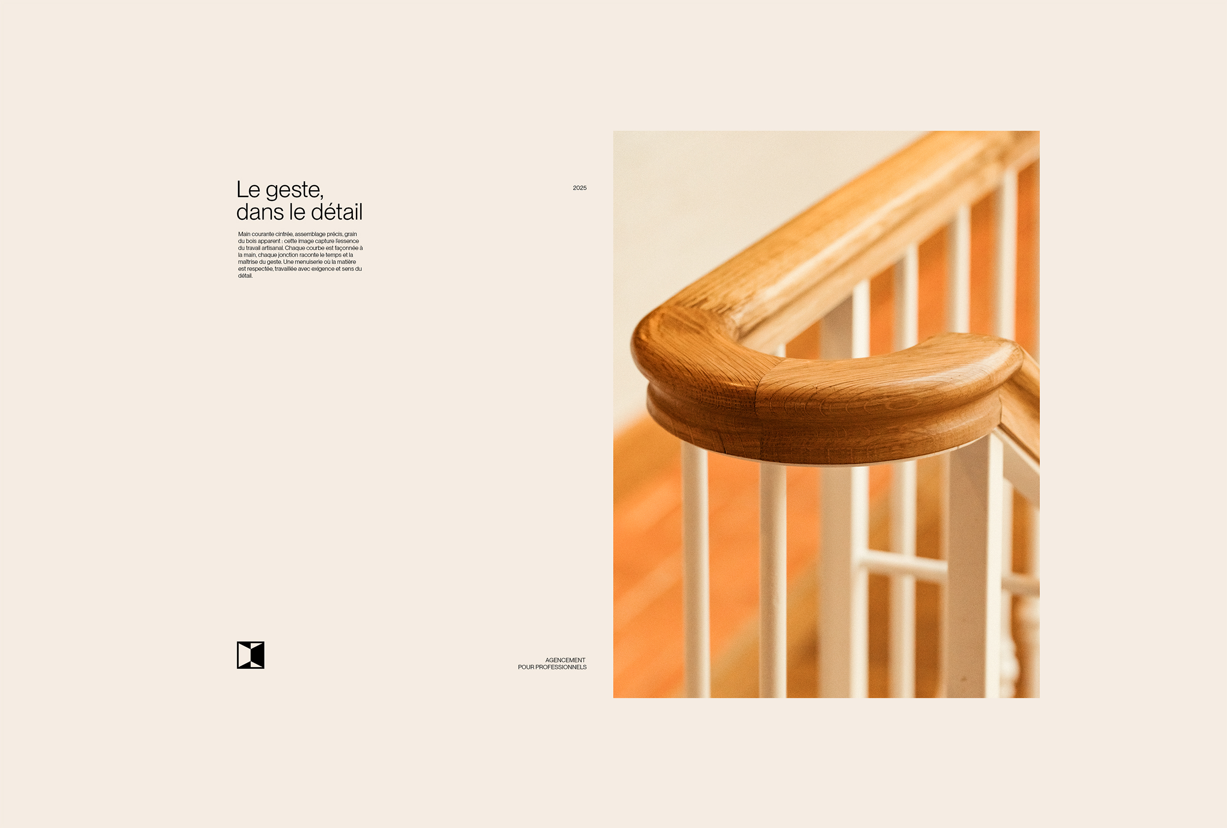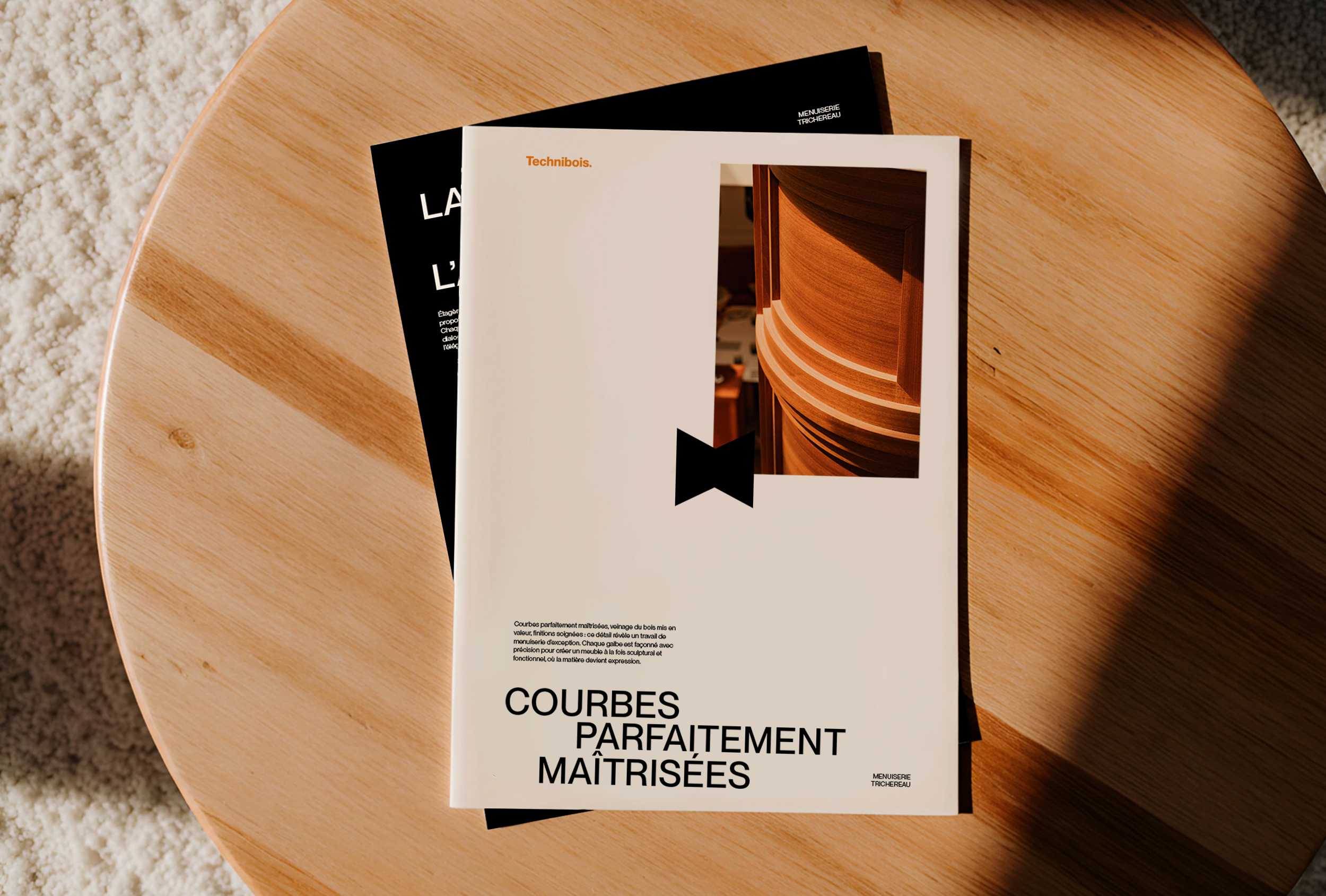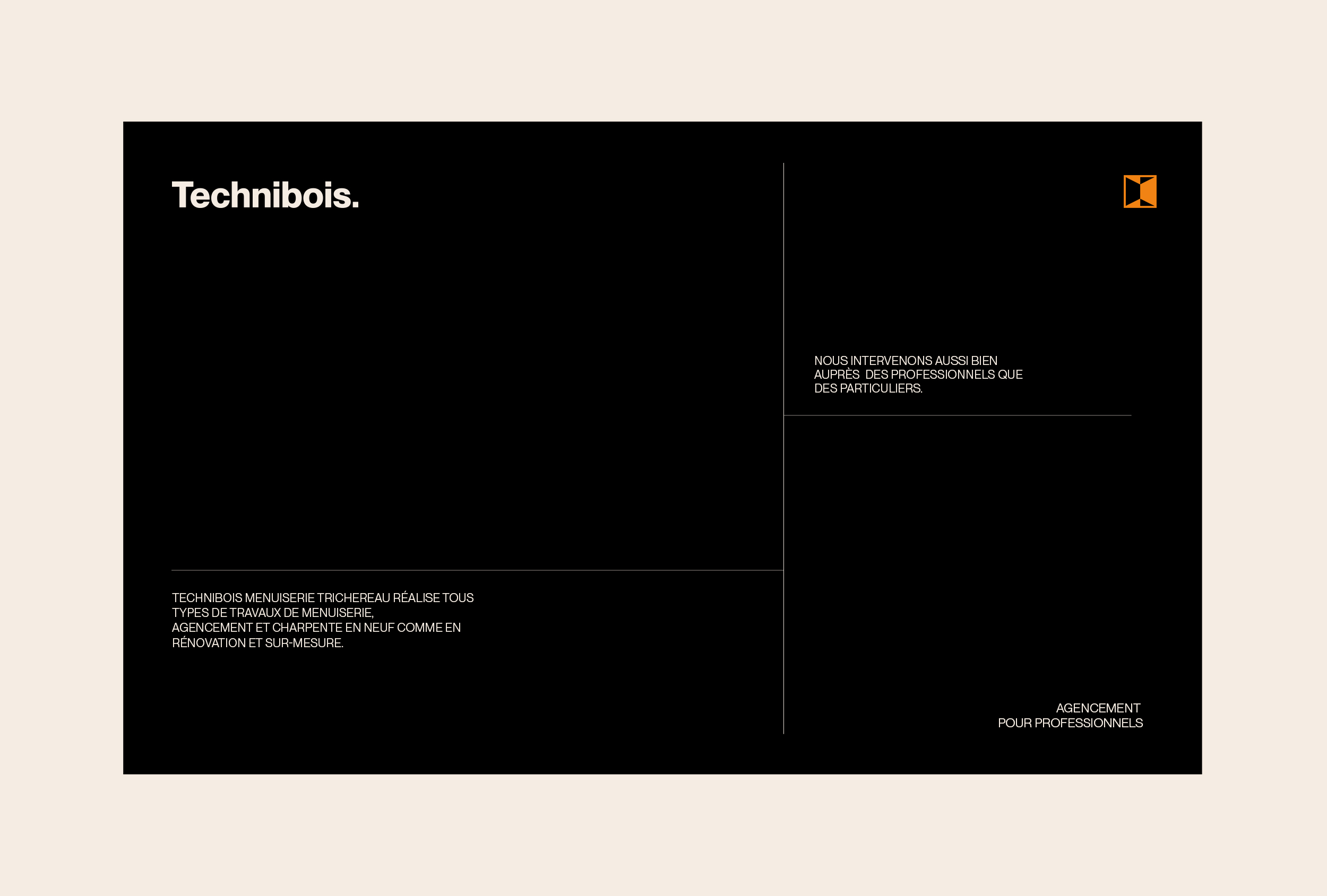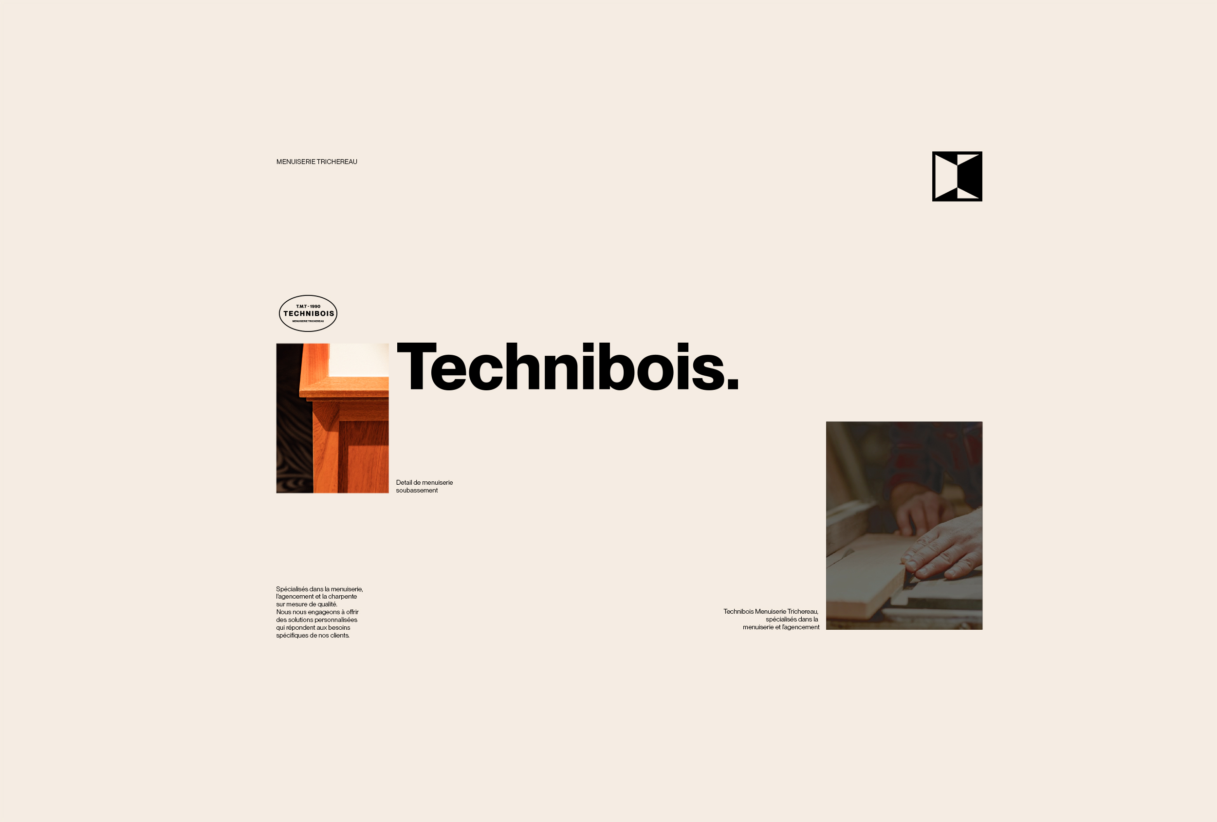 Mon approche créative s'est articulée autour de la valorisation du savoir-faire artisanal unique de l'entreprise. J'ai notamment conçu un monogramme distinctif en forme de queue d'aronde, symbole de l'assemblage précis et durable, qui est devenu un élément central de la nouvelle identité visuelle. L'ensemble de la refonte met en lumière la qualité du travail artisanal et le souci du détail qui caractérisent Technibois.